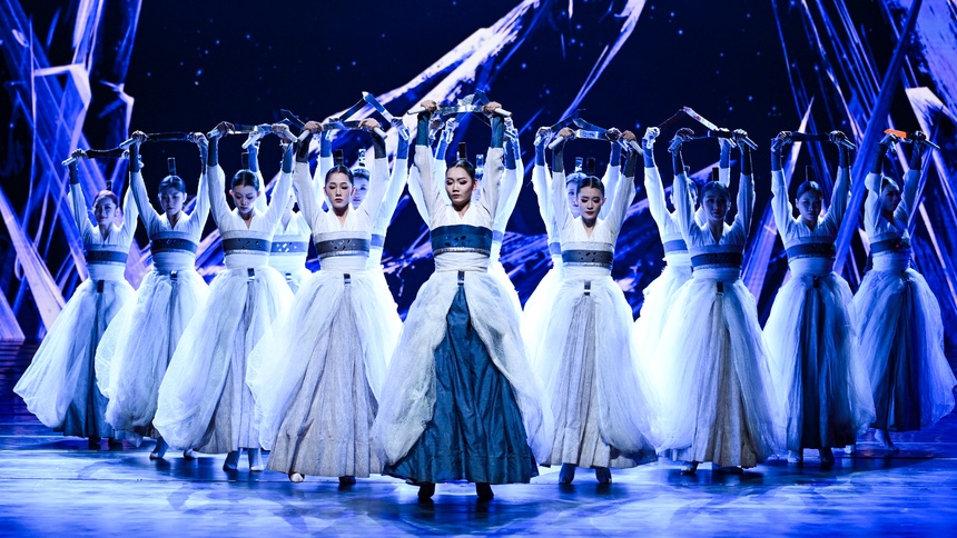 在载歌载舞的《鱼跃龙门步步高》中,当晚的演出拉开了序幕。整场演出分为四个篇章。第一篇章是“瓣瓣同心汇京畿”,北京市歌剧舞剧院演员闫羽如、天津交响乐团特邀演员张博、河北省歌舞剧院演员吴皓月共同演唱歌曲《瓣瓣同心》,唱出了三地人民携手共进的心声;获得文化和旅游部群星奖的北京物资学院合唱团演唱了《少年》,青春的旋律让人沉浸其中;获得中国舞蹈荷花奖的作品《冬》,以双刀舞为载体,通过刚柔并济的肢体韵律,让观众感受到生命的顽强绽放。