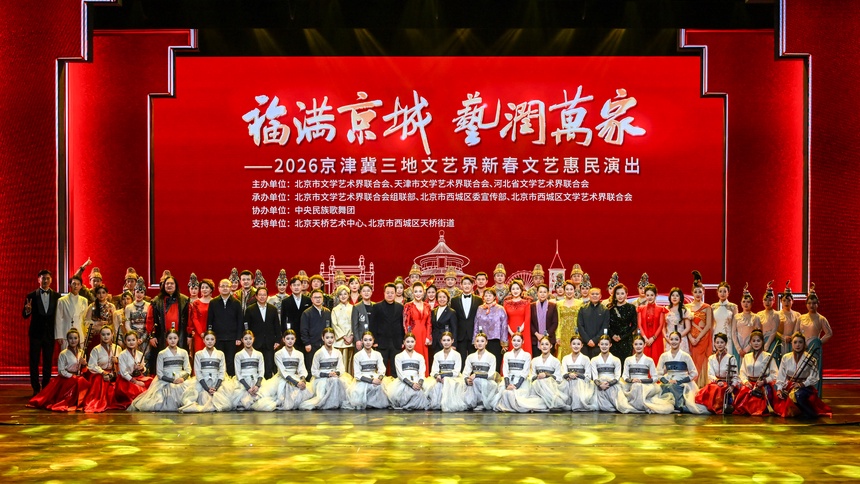 中传云资讯系统1月20日晚,2026京津冀三地文艺界新春文艺惠民演出在北京天桥艺术中心举办,北京市文联“福满京城 艺润万家”春节文化惠民活动同步启动。此次活动由北京市文联、天津市文联、河北省文联共同主办,北京市文联组联部、西城区委宣传部、西城区文联联合承办,中央民族歌舞团协办,北京天桥艺术中心、西城区天桥街道支持。京津冀三地艺术家同台,为包括建筑工人、快递员、环卫工人、社区工作者在内的北京市各区、各行业基层工作者带来精彩演出。