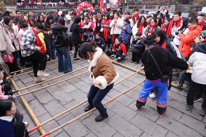 青年嘉宾在十八洞梨子寨体验竹竿舞