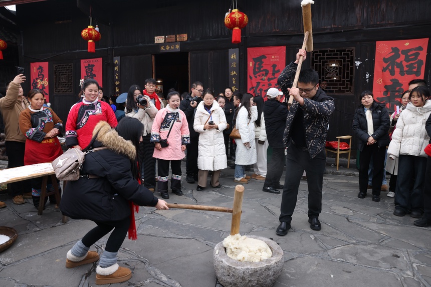 青年嘉宾互动体验打糍粑